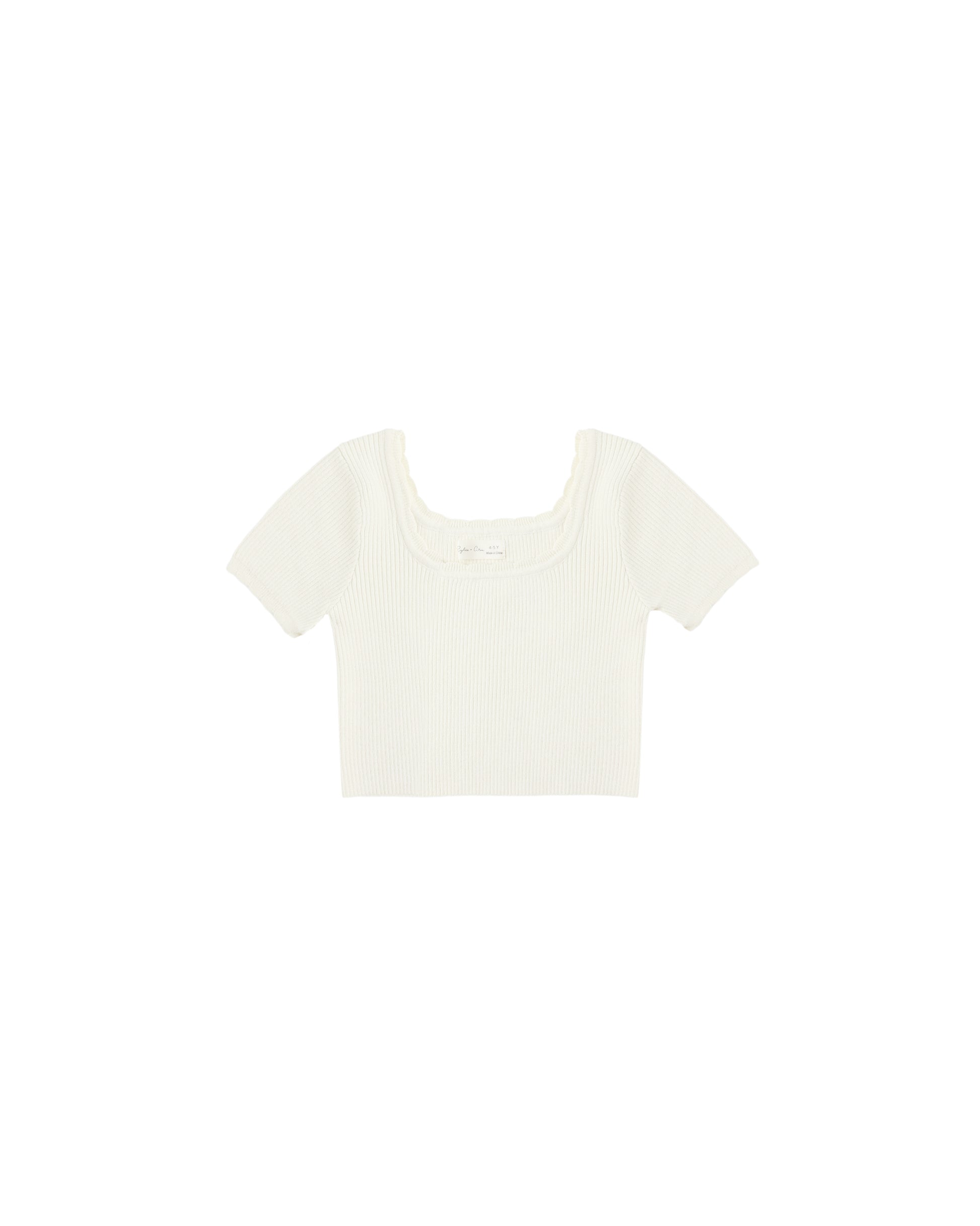 Our cropped-fit Scalloped Tee is a versatile fall staple, crafted from delicate pointelle knit fabric and detailed with scalloped sleeves and neckline.