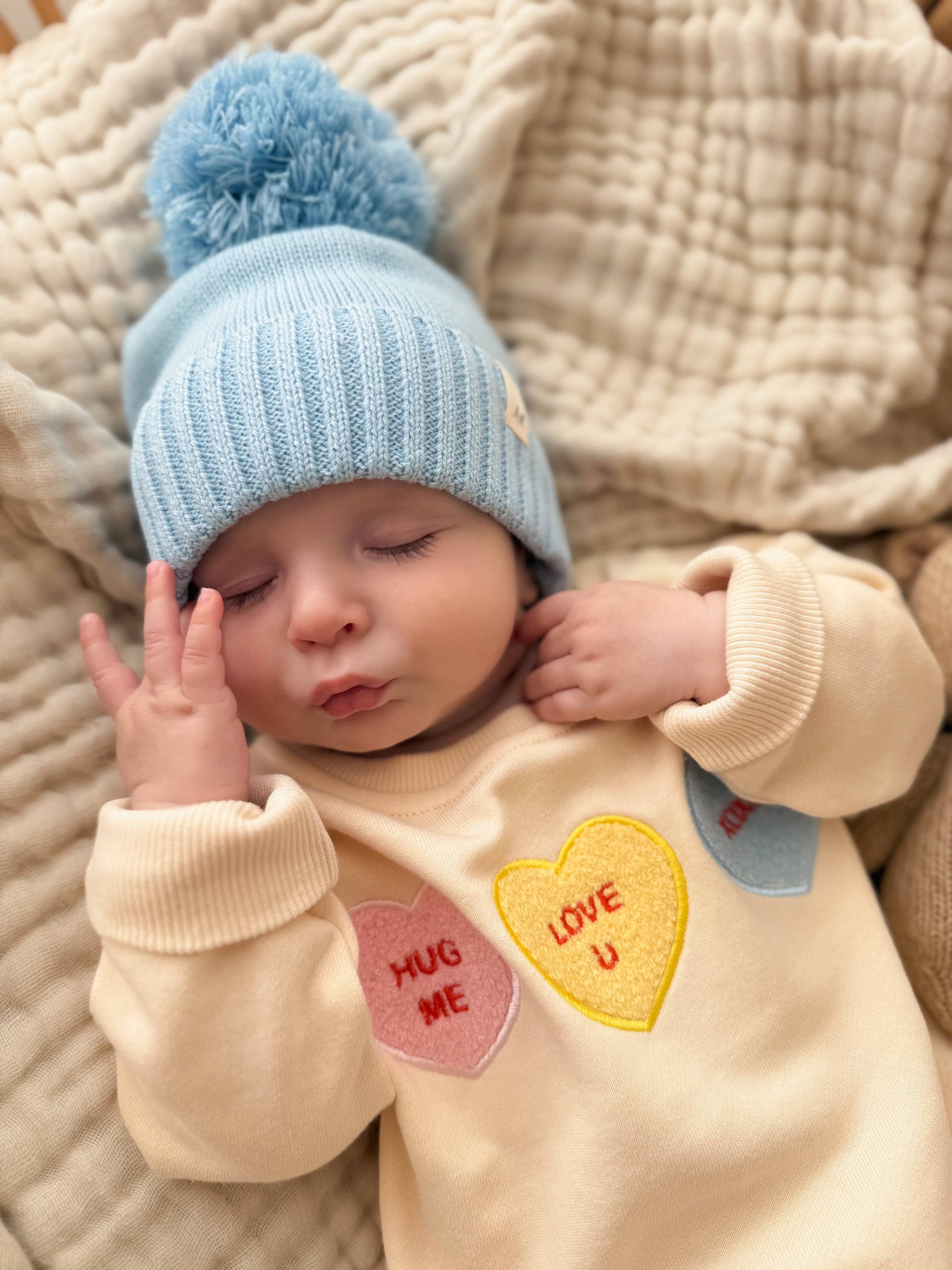 "Hug Me." "Love U." "XOXO." Candy hearts are the highlight of every Valentine's day. These sugary sweet hearts with words and phrases of endearment are reminiscent of the sweetness of all the little loves. Made from chenille embroidery, these hearts are soft and plush to the touch. The oversized bubble romper provides a cozy comfort and adorable look for your baby. Tell them "Be Mine" this Valentine's season by dressing them in this loveable romper.
