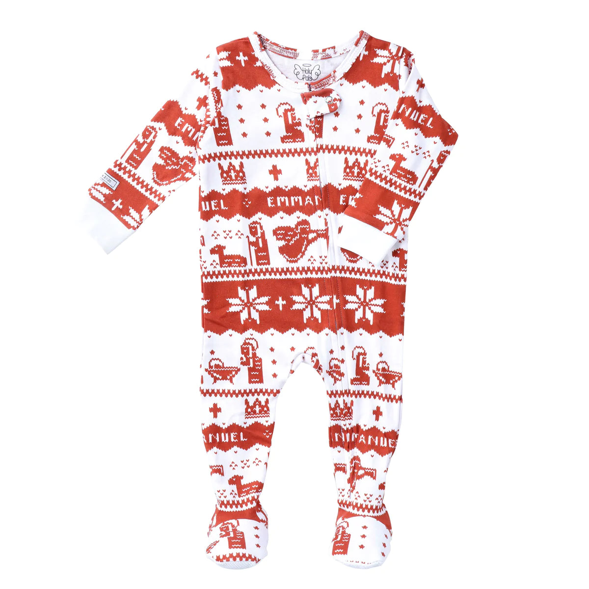Wrap your family this Christmas with our joyful Emmanuel Christmas Pajama Set. This red and white illustration of the birth of Jesus is the perfect design to brighten your Christmas family pictures with traditional Christmas colors!