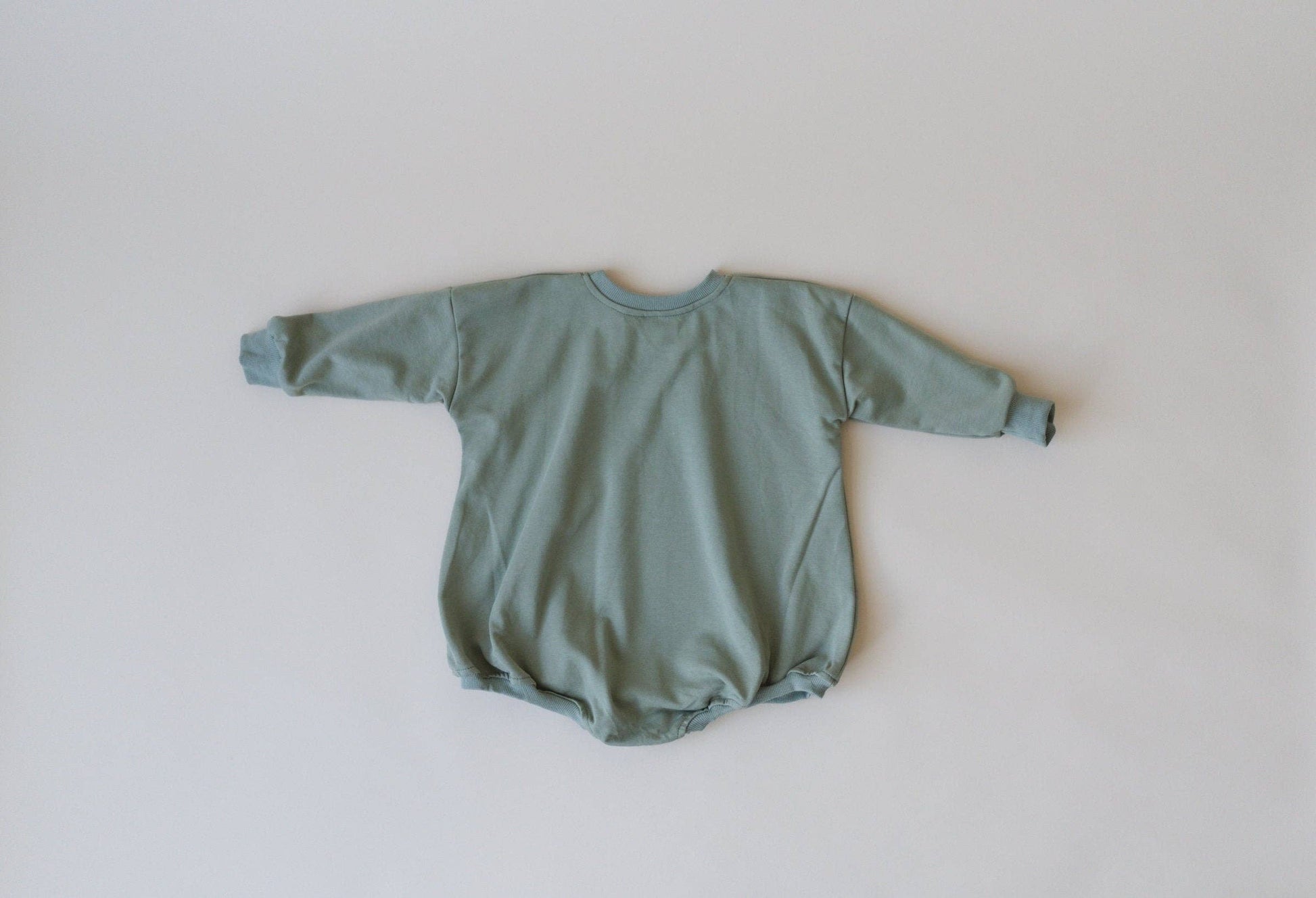 Christmas tree truck graphic oversized sweatshirt romper with snaps at crotch. Lightweight terry material.