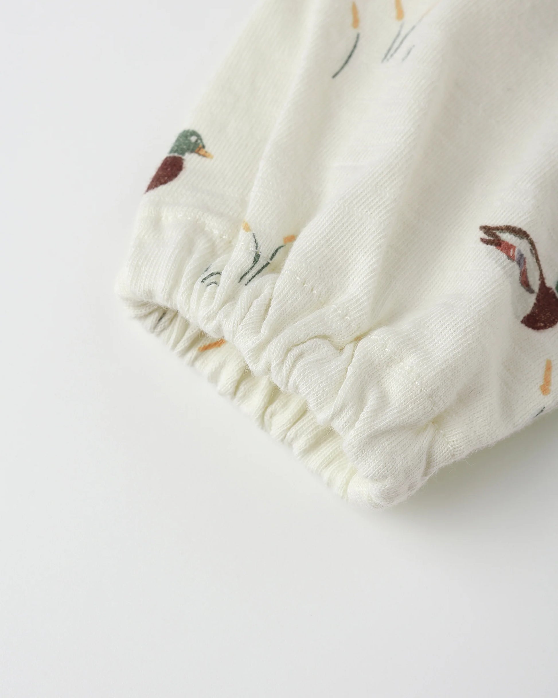 Our Henley Jumpsuit features a bubble silhouette with elasticized wrist and ankle openings, a two-button front placket, and bottom snaps for easy changes.