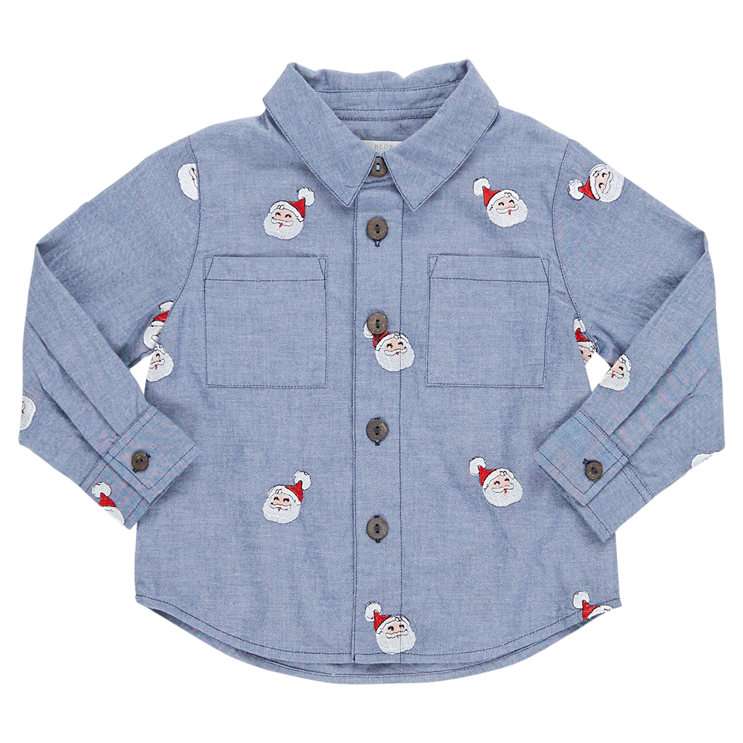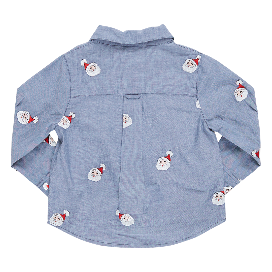 Jolly Ole St Nicks! Sweetly embroidered vintage-inspired Santas give a friendly wink from atop a dapper chambray ground on our Boys Jack Shirt. Designer details include two front chest pockets, perfect for a mini candy cane or two, cuffed sleeves and dapper faux coconut buttons. We love the center pocket detail, perfect for tucking away a sweet holiday treat. Faux wood button closure at shoulder. Ring snaps at bottom allow for easy diaper changes.