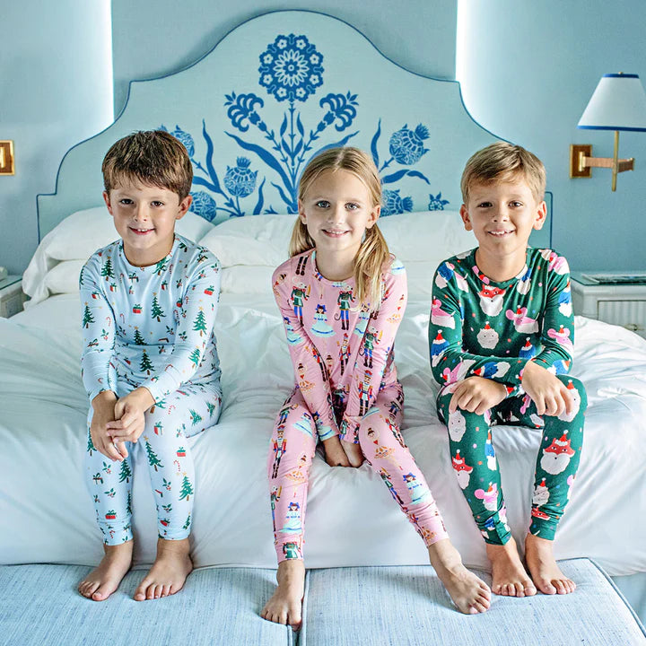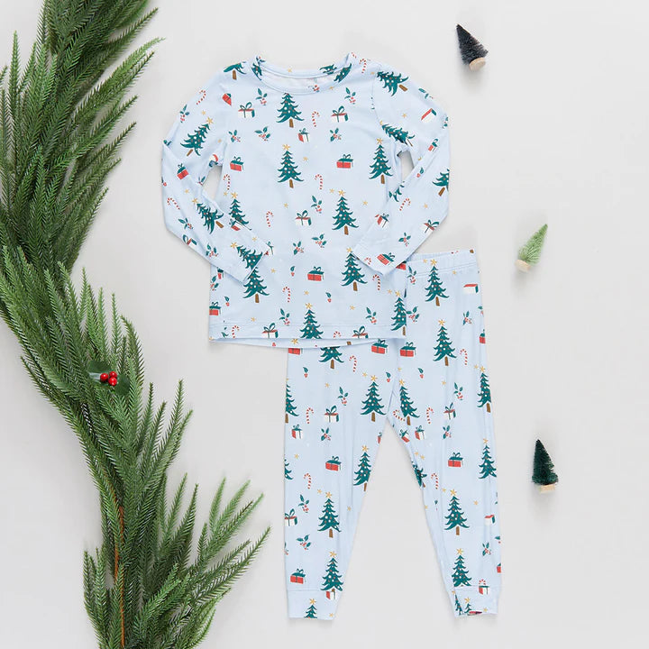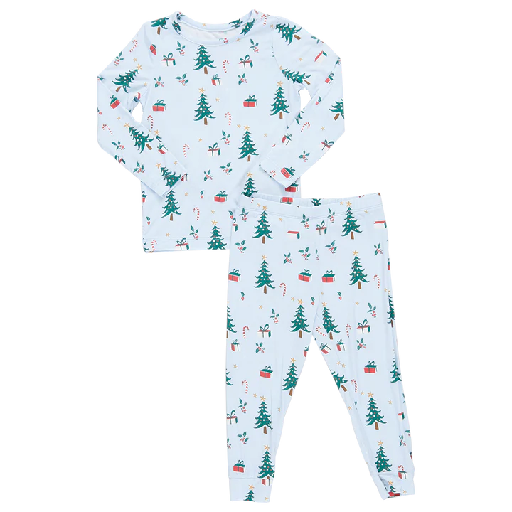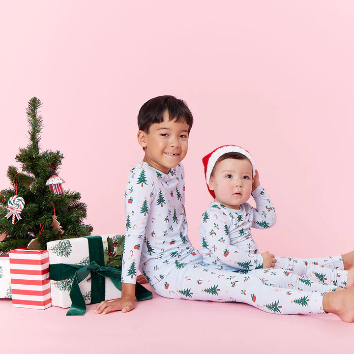 Tis The Season! All of your holiday favorites - crisp candy canes, bedecked trees, promising packages and more - make an appearance in our delightful Holiday Cheer print. Crafted in an icy blue bamboo fabric, our Kids Bamboo PJ Sets are crazy soft with a smooth, silk-like texture. Bamboo is breathable and it keeps littles cool & comfortable in the summer and warm & cozy in the winter. Set includes a long sleeve top and elastic waist pants.