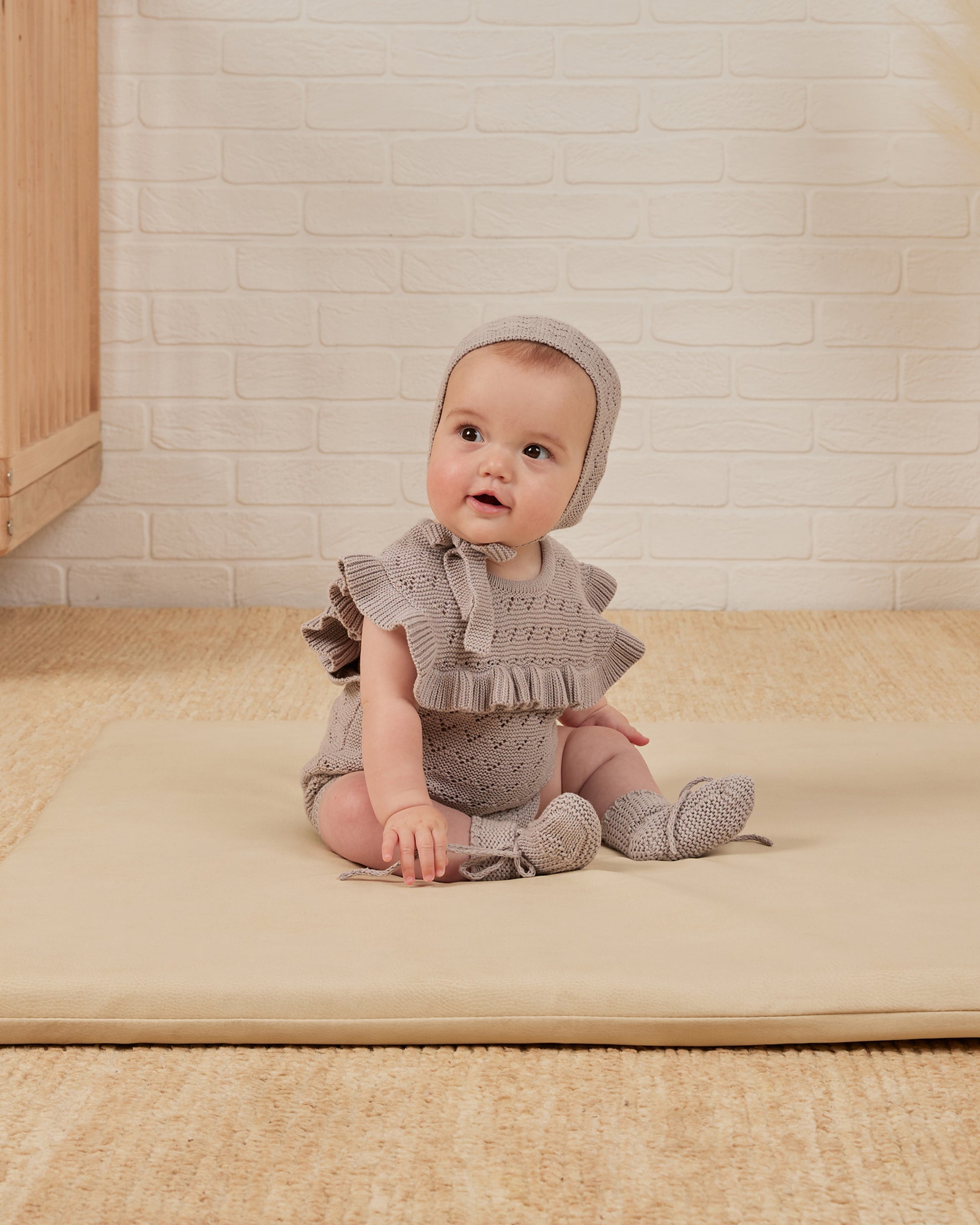 Adorable sweater knit booties with ties at the ankle for a secure fit.