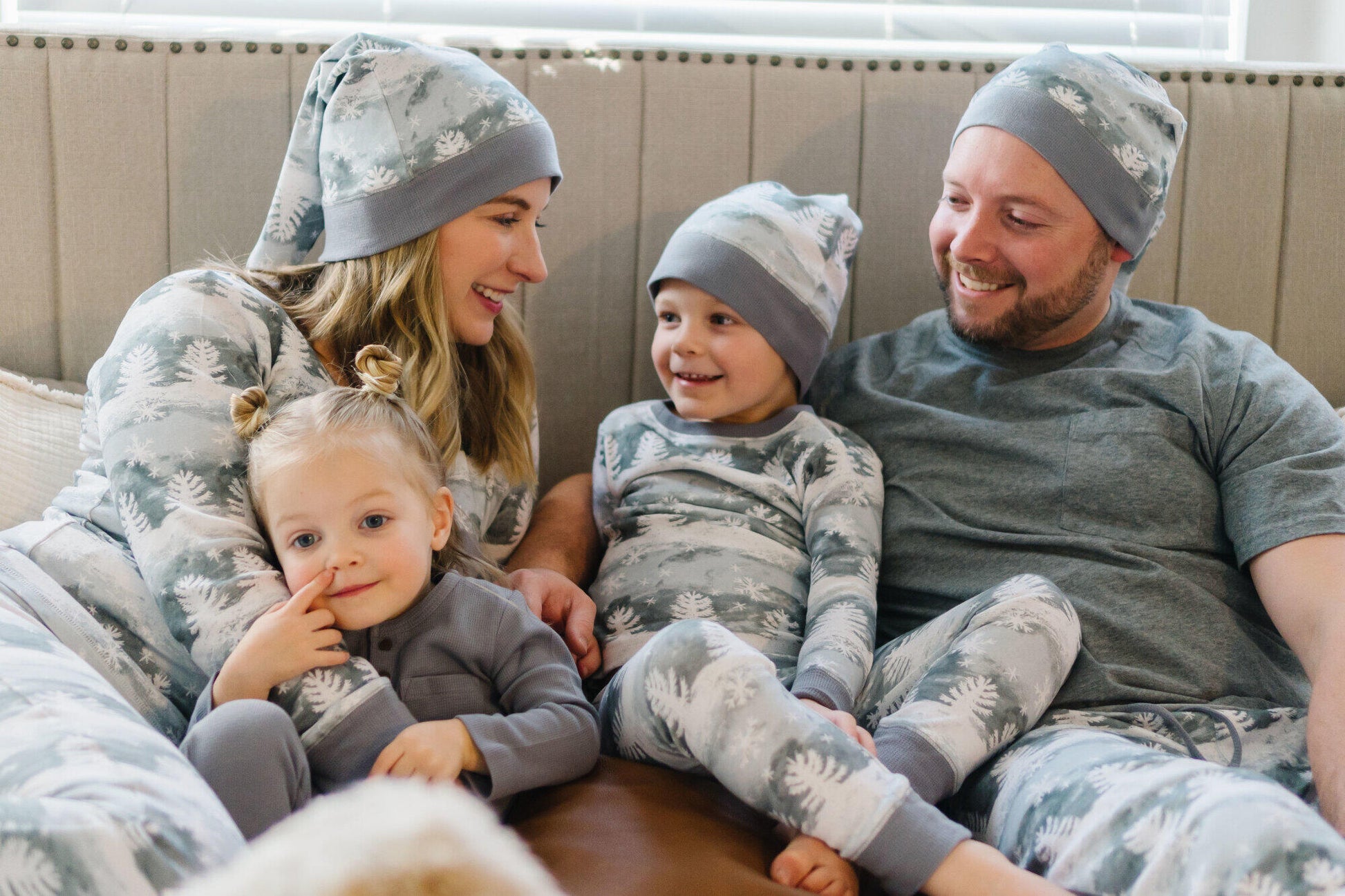 This pattern is a beautiful winter wonderland print with snowy hills with grey and a soft mint coloring. Perfect to mix and match with our Thermal Sleeper in Mist as well as the matching Winter Wonderland print in sleepers and kids PJ sets.