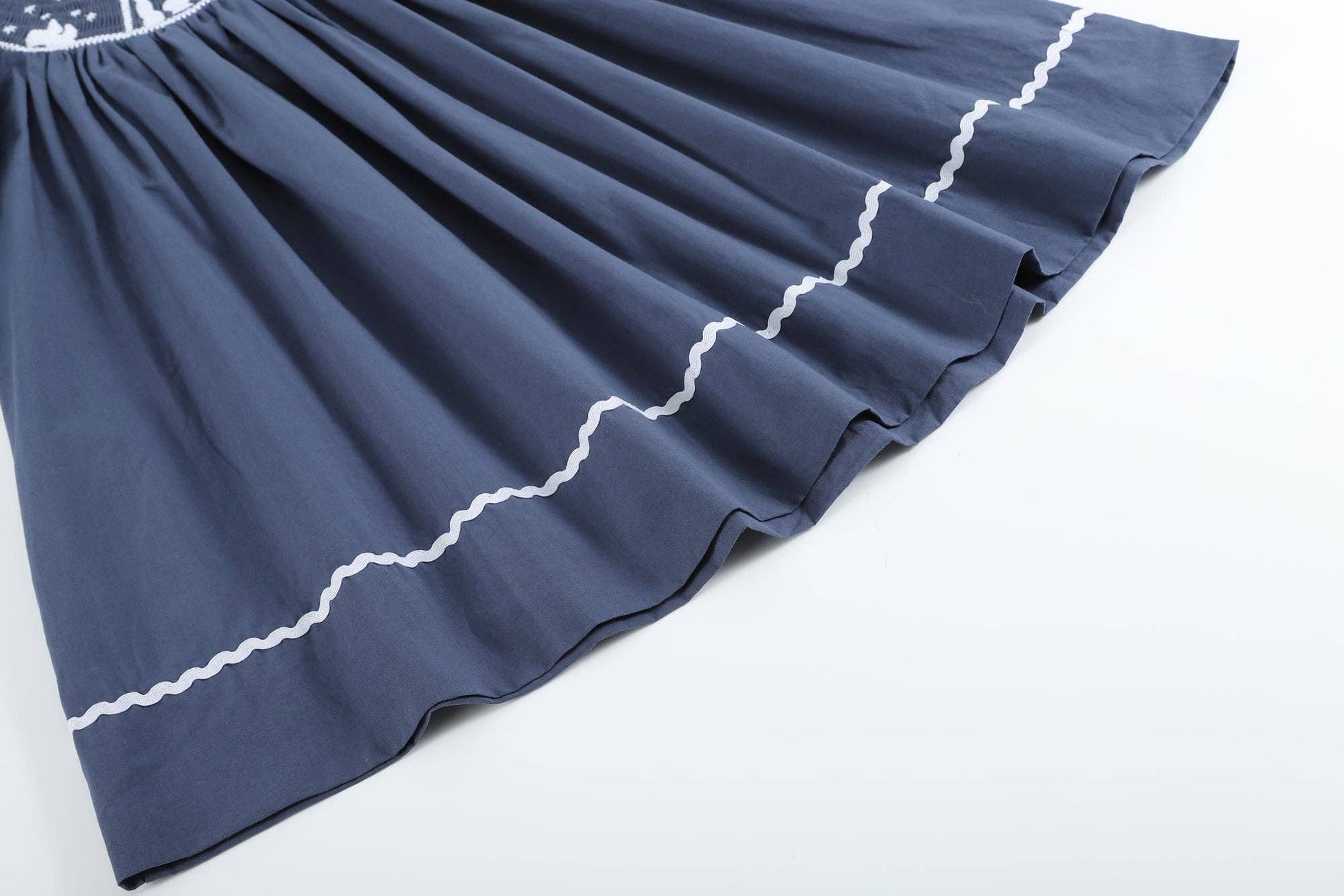 Stunning and Sweet! This beautiful navy blue dress by Lil Cactus features a beautiful Christmas nativity embroidery, long sleeves, white trim, and smocking.