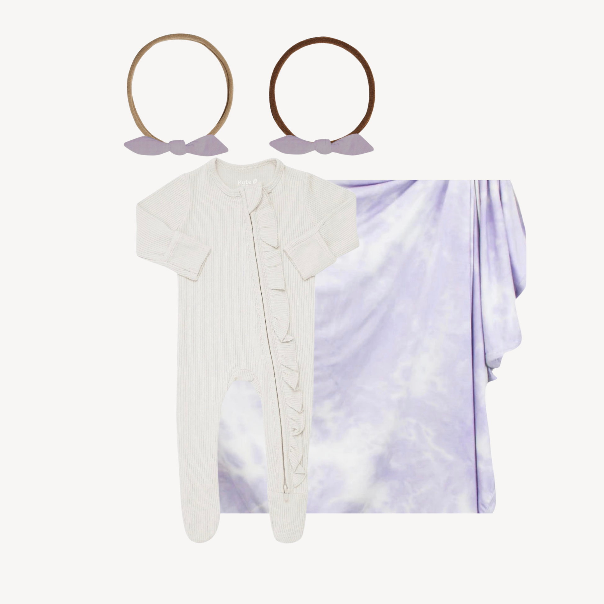 Ribbed Ruffled Zipper Footie in Oat, Dani Swaddle Blanket & Nylon Headband (3-6M)