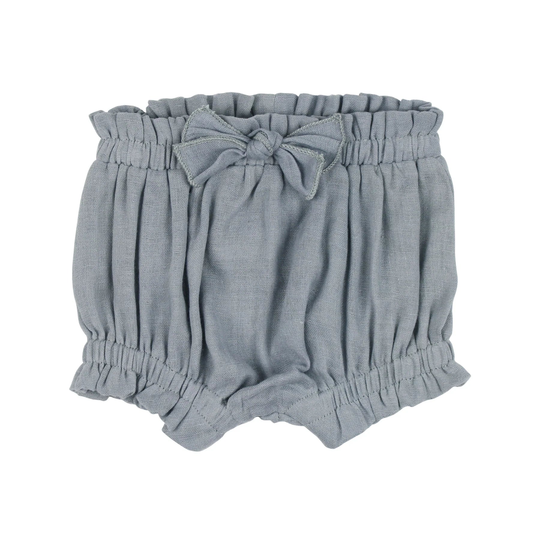 These muslin ruffle bloomers feature a ruffle detail at the thighs and a little bow at the waist for added cuteness. A soft elastic at the waist and around thighs provide total comfort for baby as well as tagless for optimal comfort against baby's skin.