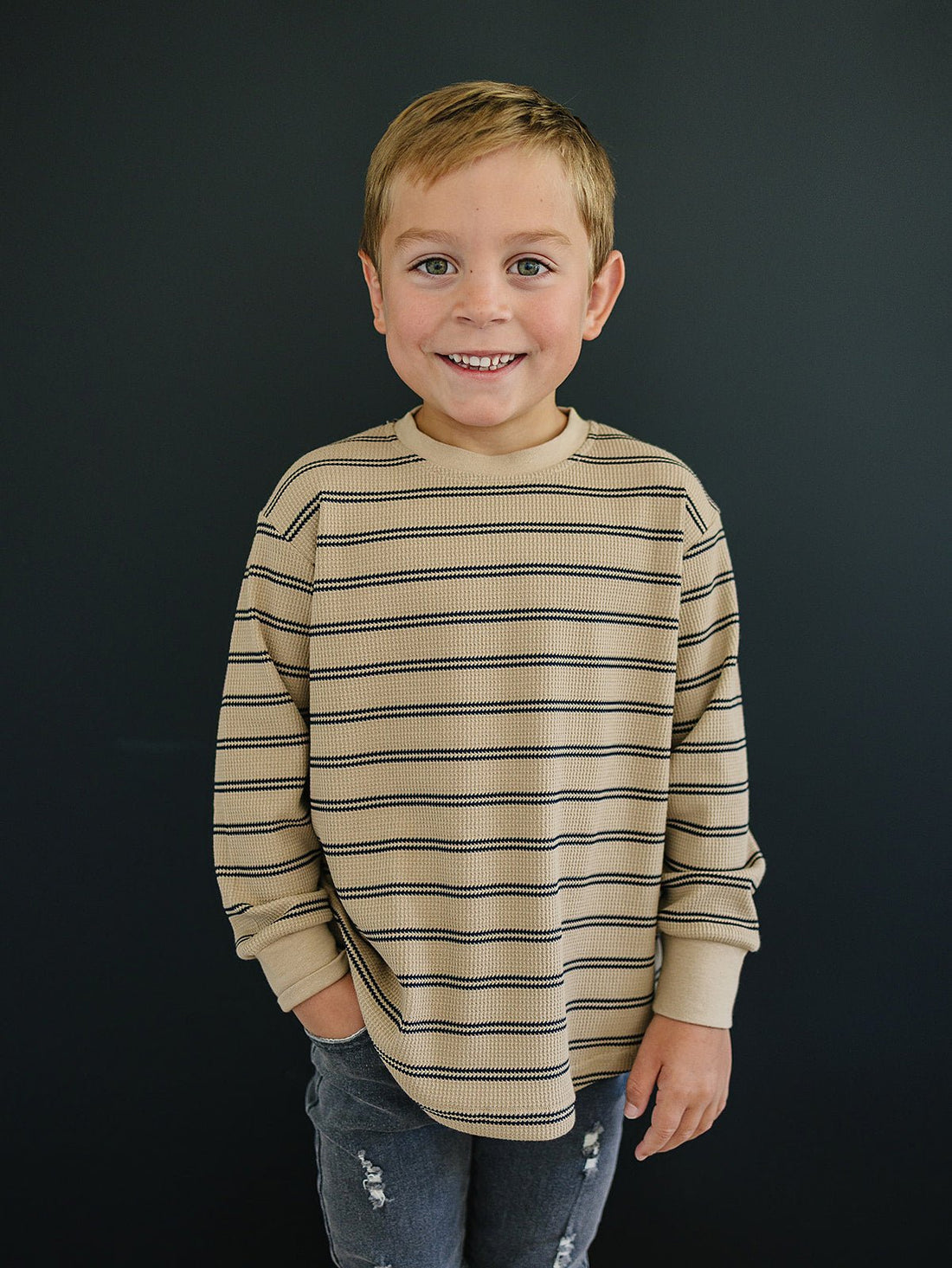 Wrap your little one in cozy comfort with the Ozzy Long Sleeve. Made from super soft waffle fabric, this playful top features classic double stripe lines and a trendy drop hem for extra coverage. Perfect for pairing with any of our jeans, it’s a fun and versatile addition to their wardrobe that they’ll love wearing all day long.