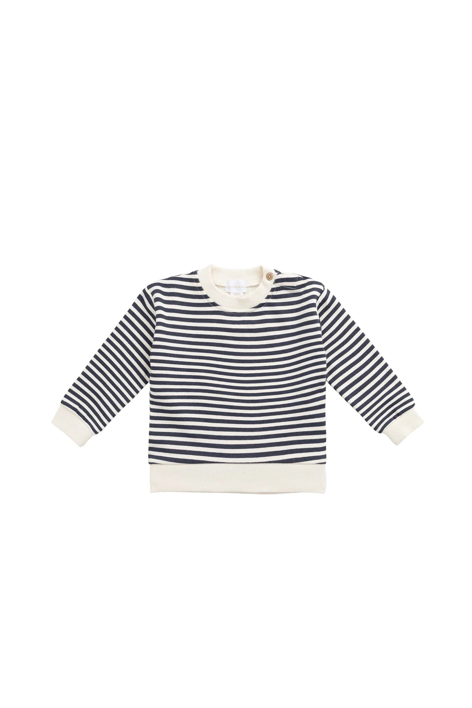 Soft sweatshirt featuring a slim horizontal stripe of ivory and navy blue. Relaxed fit for easy layering.