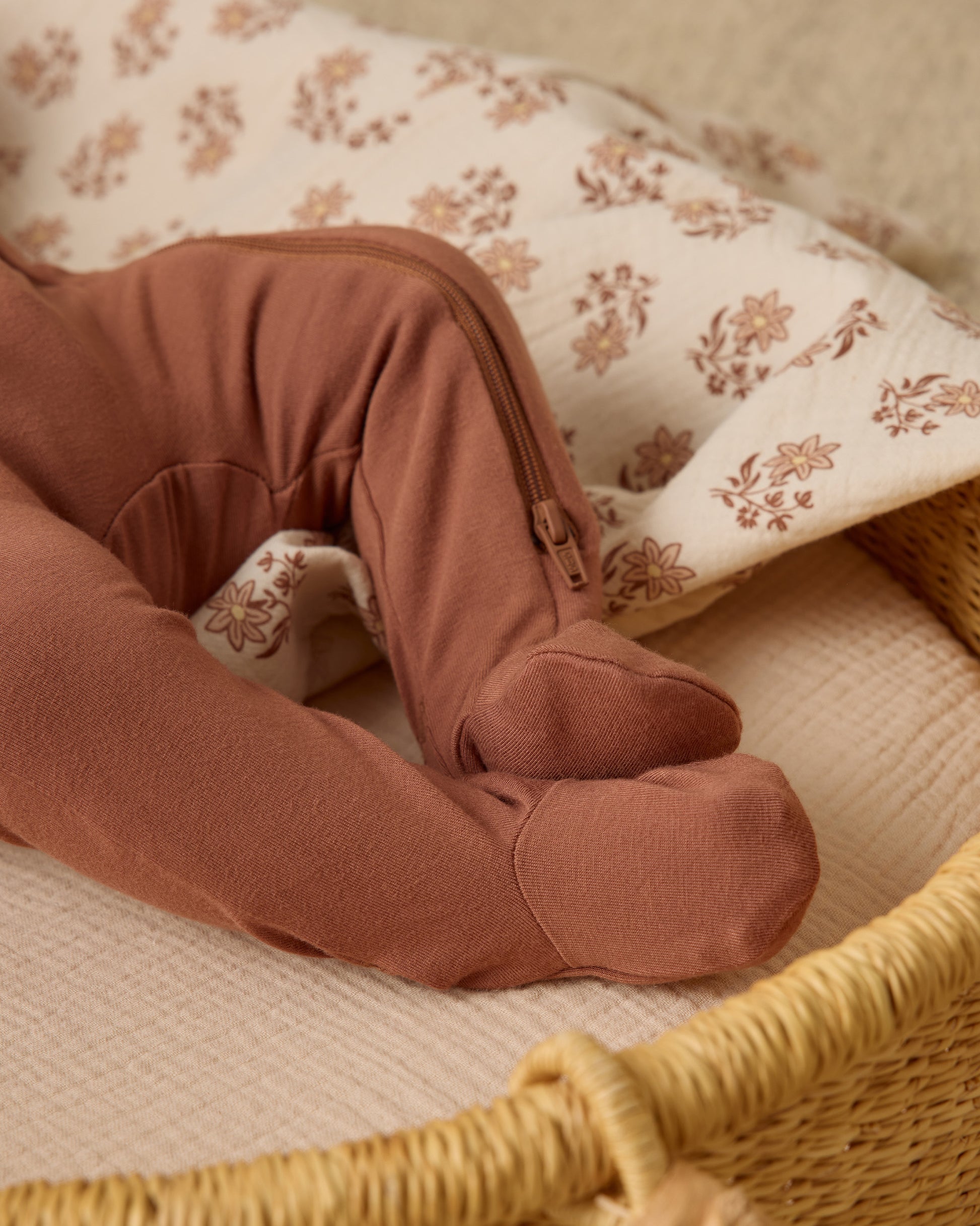 Full double-zip footie crafted from our soft and stretchy bamboo fabric. Fold-over hand mitts included on sizes NB – 3-6M. Raised screen print on soles of size 6-12M for added traction.
