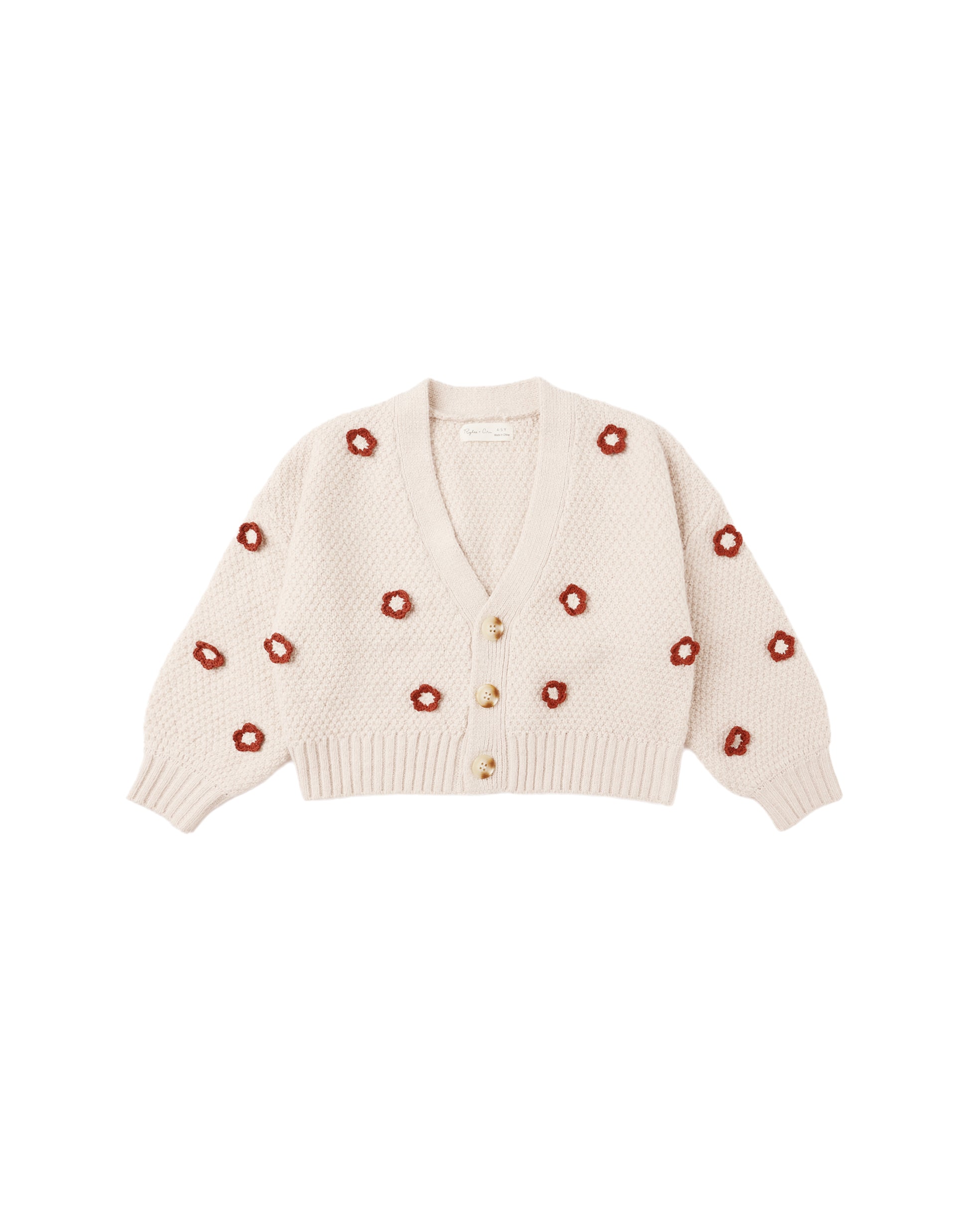 Cardigan: Made of 100% polyester. Appliqué: Made of 100% cotton.