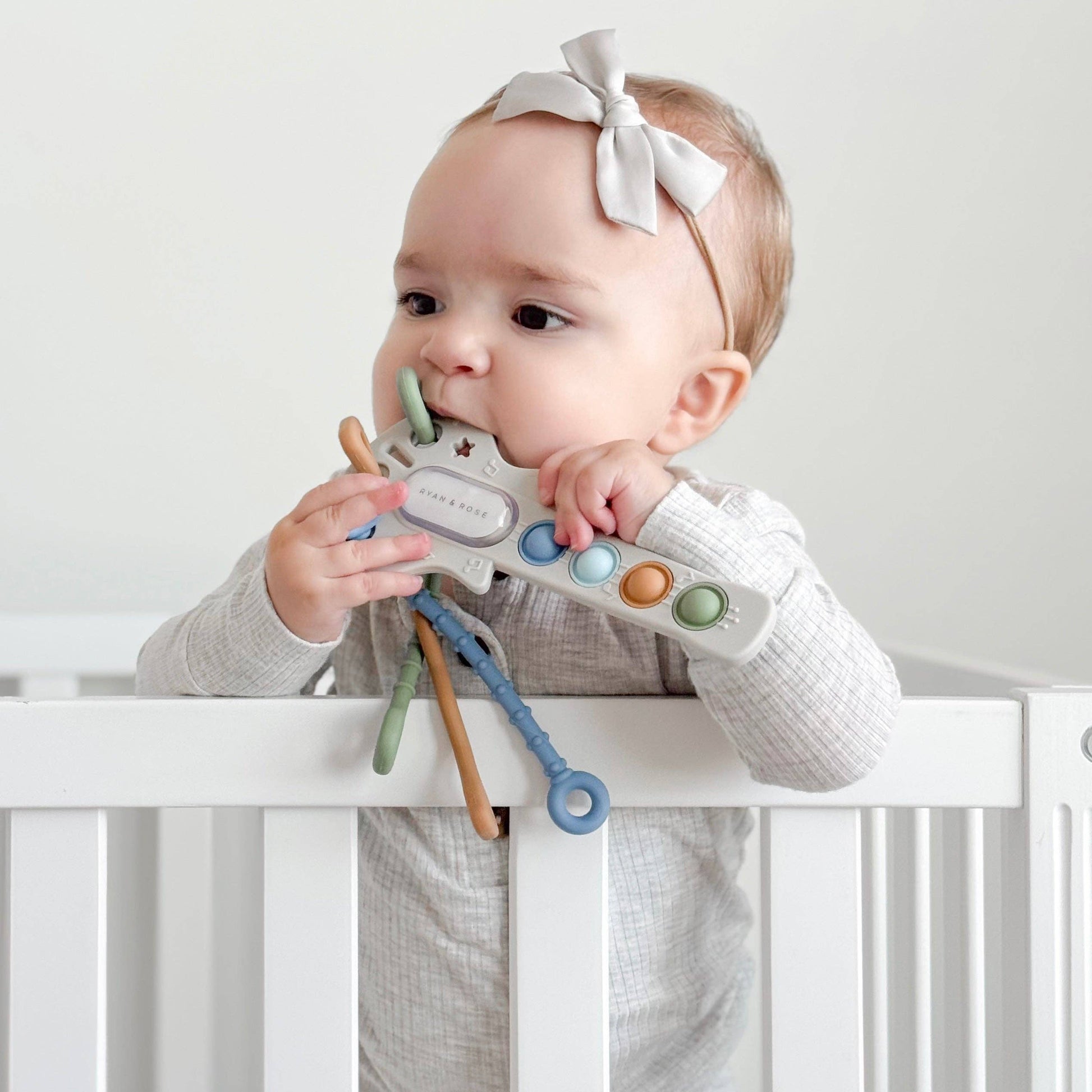 Featuring three textured silicone strings, four colorful pop-its, and a built-in mirror, the Rockin’ Guitar Toy is thoughtfully designed to stimulate vision, attract attention, and promote color learning, all while fostering both curiosity and creativity.