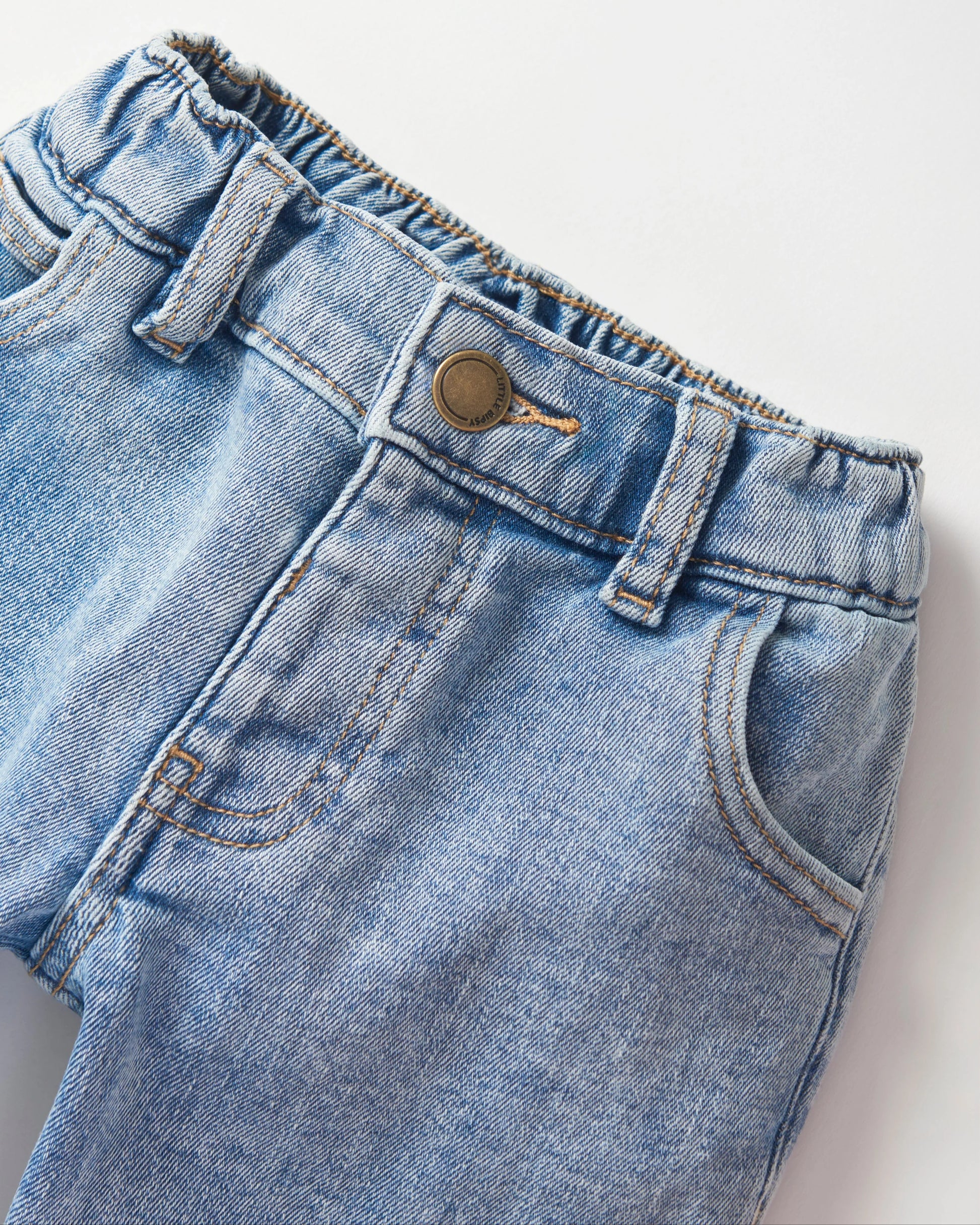 Your little’s new go-to jean is here. Designed in a classic light wash with a relaxed straight-leg fit, these jeans bring comfort + style to every adventure. A functional front button with a back elastic waistband makes for an easy fit, while front and back pockets are perfect for stashing treasures. Finished with our signature embroidered “LB” for that extra touch of Little Bipsy charm.