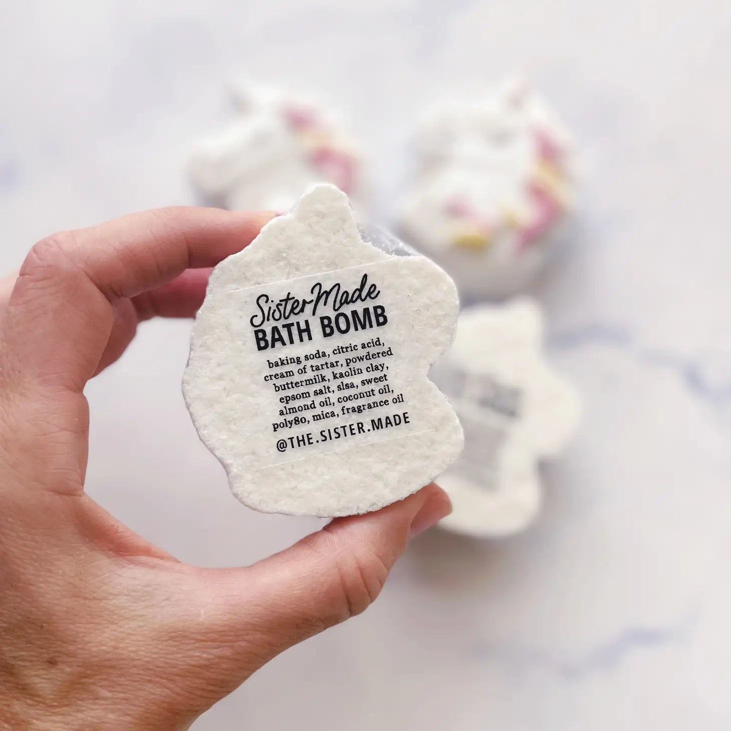 Ingredients: Baking soda, citric acid, kaolin clay, cream of tartar, epsom salt, powdered buttermilk, coconut oil, sweet almond oil, slsa, poly80, mica, f.o.