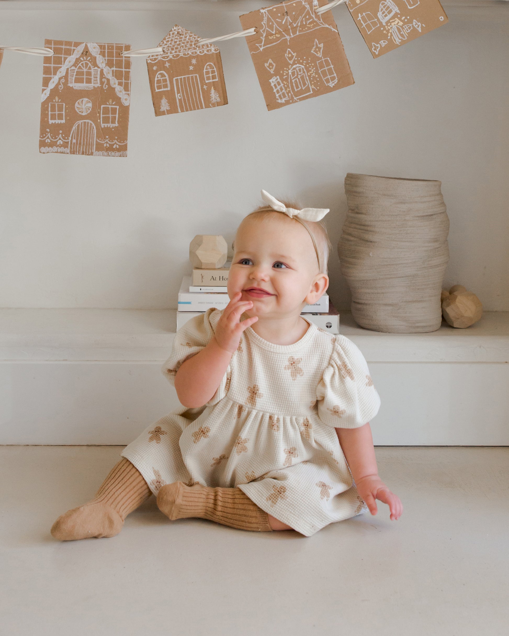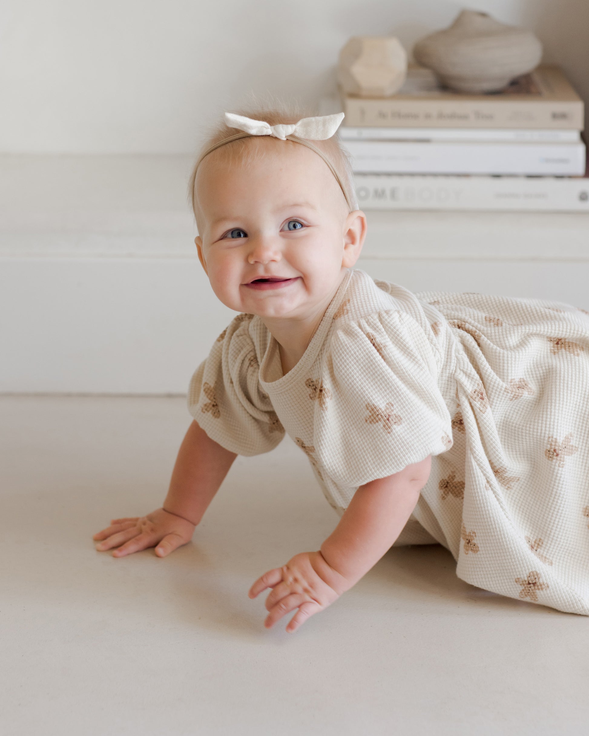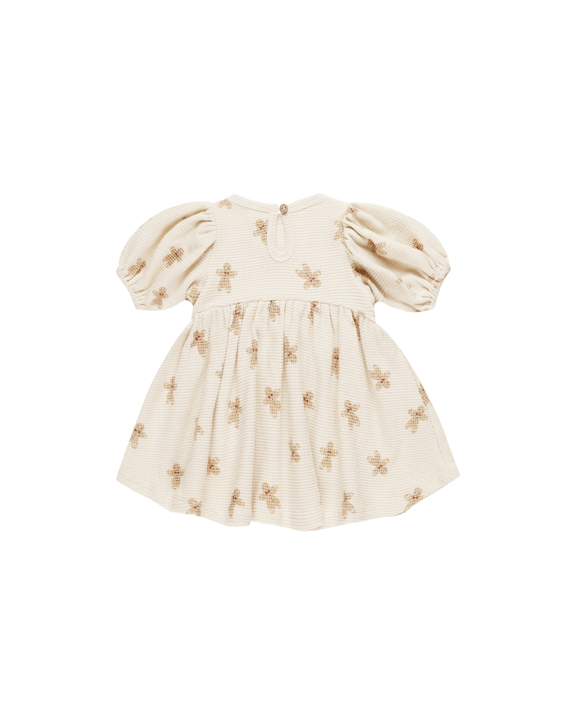 Our Babydoll Dress Set features an empire waist dress with balloon sleeves and a coconut button keyhole. It also includes matching baby bloomers.