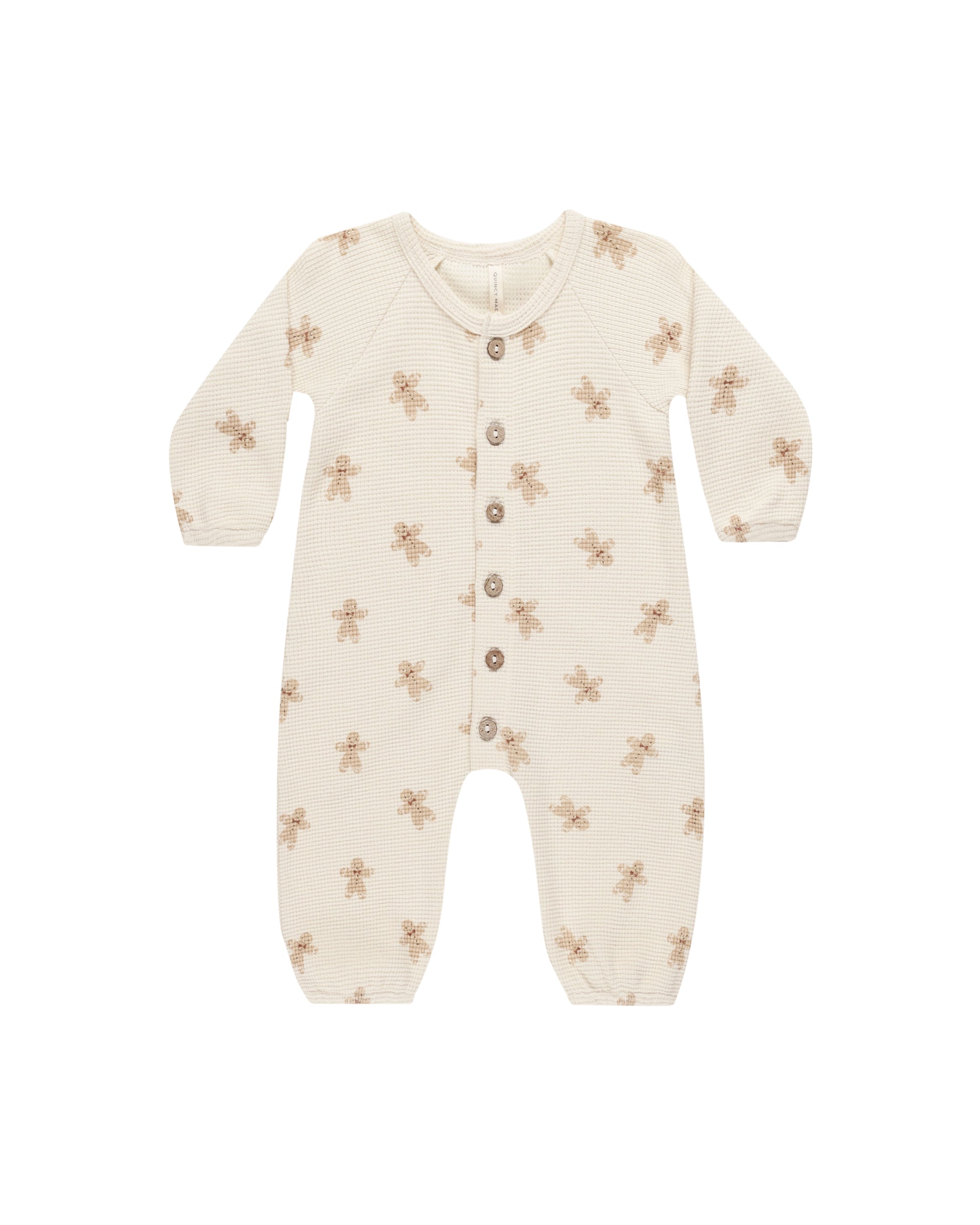 Raglan waffle longsleeve jumpsuit featuring coconut buttons down the chest and elastic leg and sleeve openings.