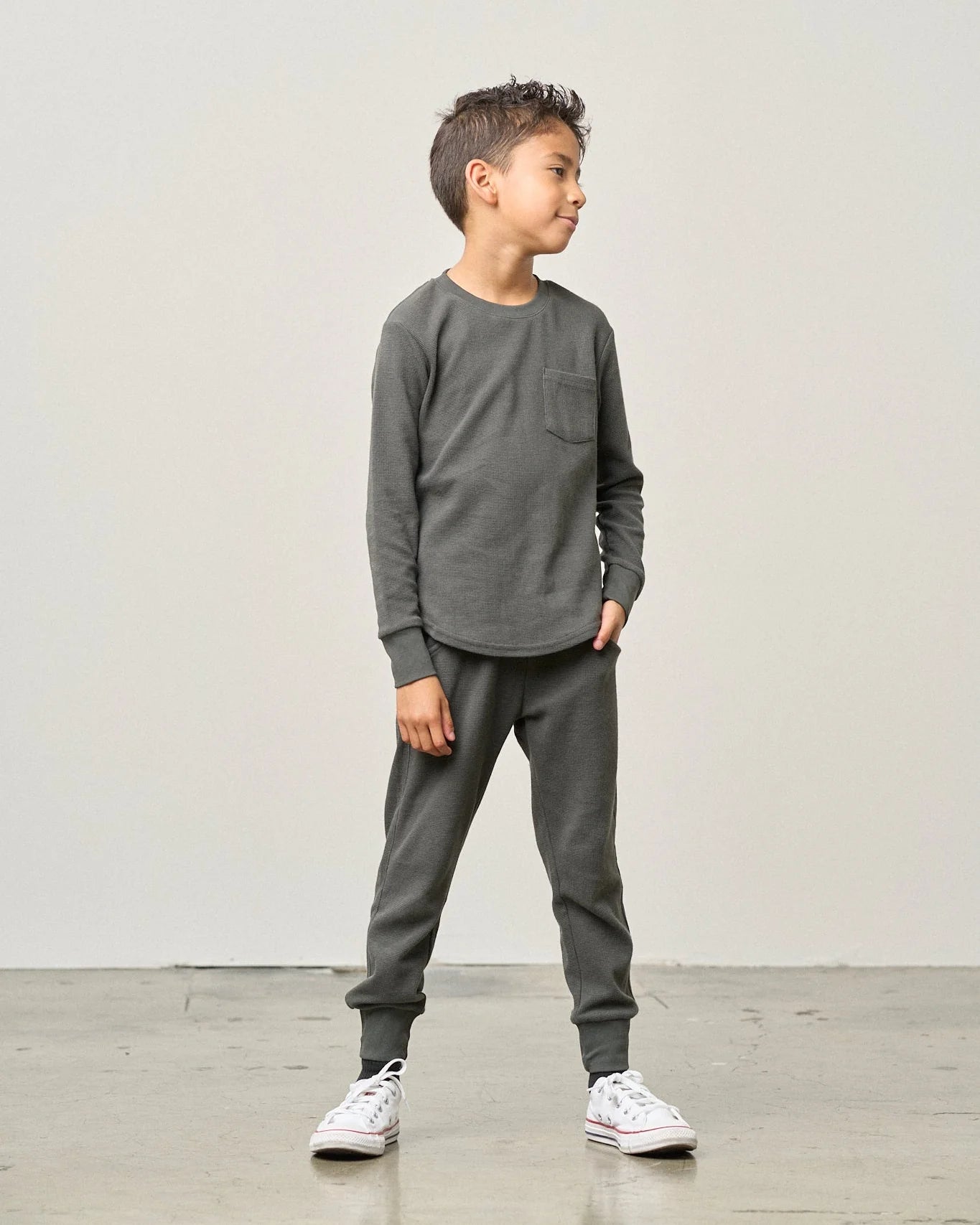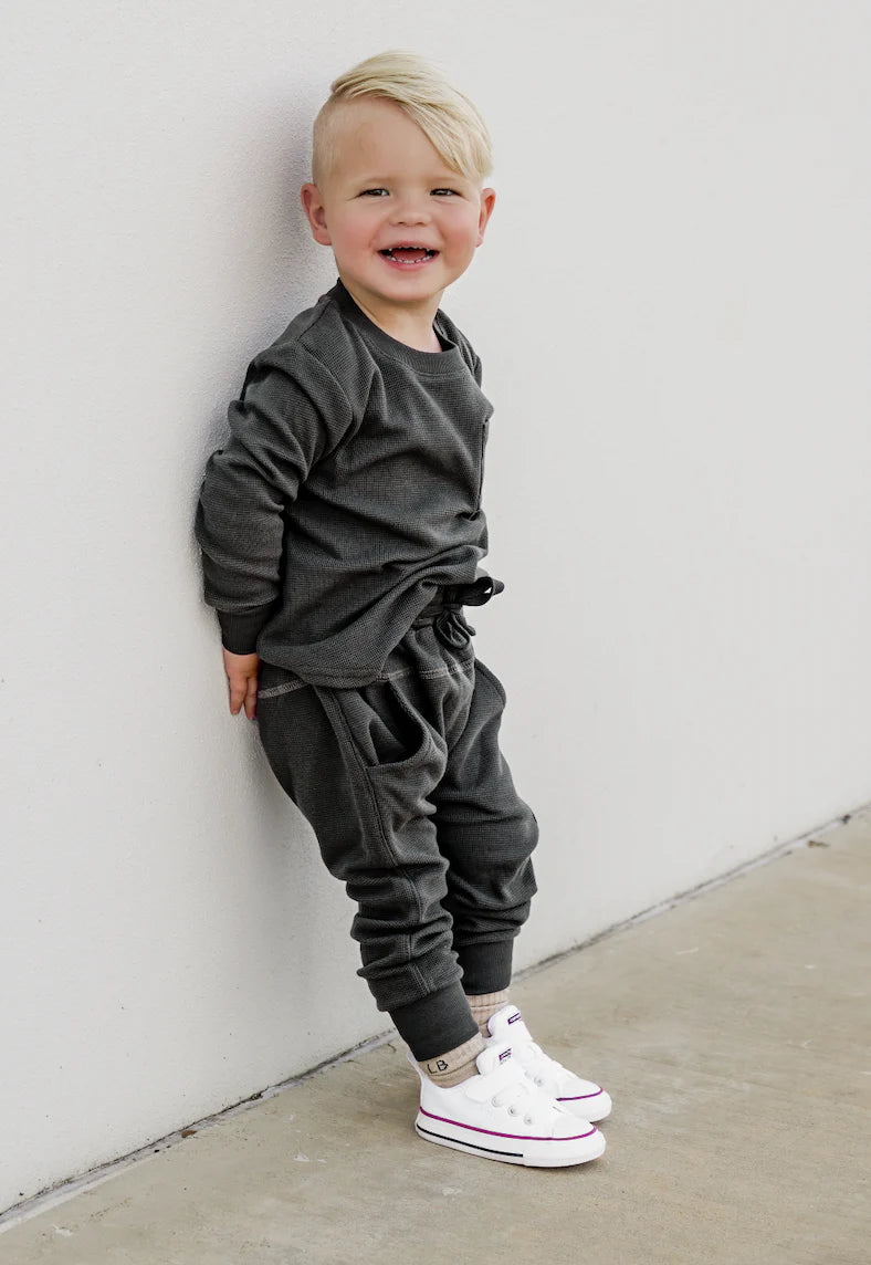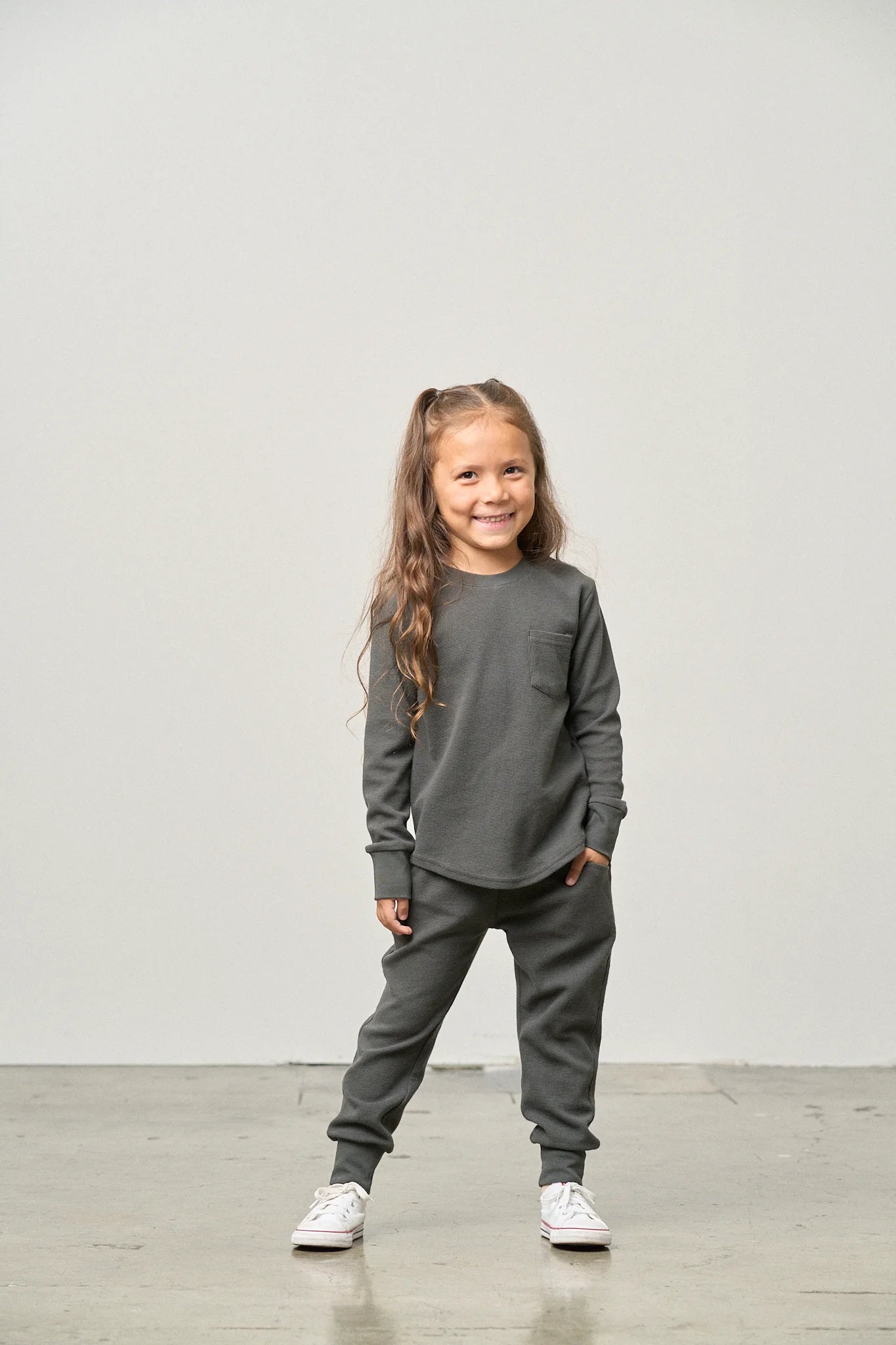 Our signature Waffle is back! Available in Shadow, Mushroom and Huckleberry, this cozy long-sleeve top offers the perfect balance of comfort and style. Crafted from soft, breathable fabric, it's designed to keep your little one cozy all season long. Available in sizes from 0-3M to 12Y, it’s a versatile staple for layering or wearing solo. Pair with our matching joggers for a complete look!